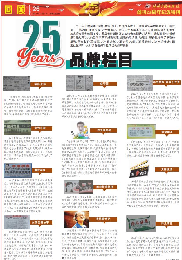 二十五年的風(fēng)雨、輝煌、磨煉、成長(zhǎng),把她打造成了一位婀娜多姿的妙齡女子。她就是——《達(dá)州廣播電視報(bào)(達(dá)州新報(bào))》。走過二十五年不平凡的發(fā)展歷程,現(xiàn)在的她更加光彩奪目和絢麗多姿。厚載著達(dá)州數(shù)萬忠實(shí)讀者的期待,《達(dá)州廣播電視報(bào)(達(dá)州新報(bào))》經(jīng)過幾次大的新聞改革和報(bào)紙改版,報(bào)紙的可讀性、地域性、服務(wù)性得到了不斷的增強(qiáng),孕育出了《詩凡話題》等一大批讀者喜聞樂見的優(yōu)秀品牌欄目。